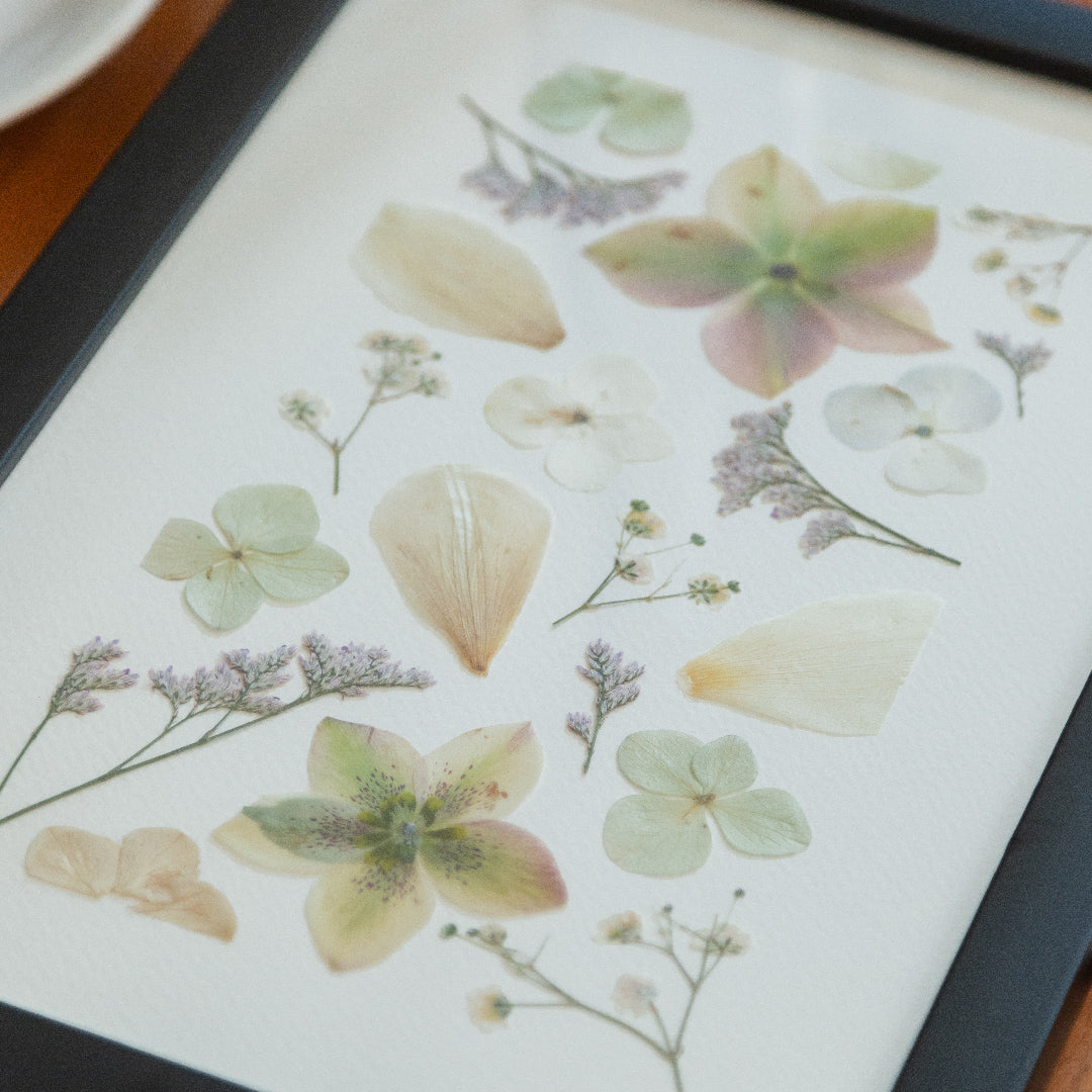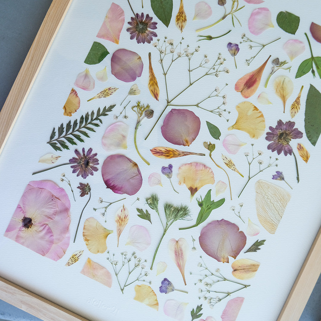 Ramo o flores prensadas, convertidas en un cuadro. Las flores se prensan por un periodo de máximo 30 días para luego armar una composición y obra en base a sus formas y colores.