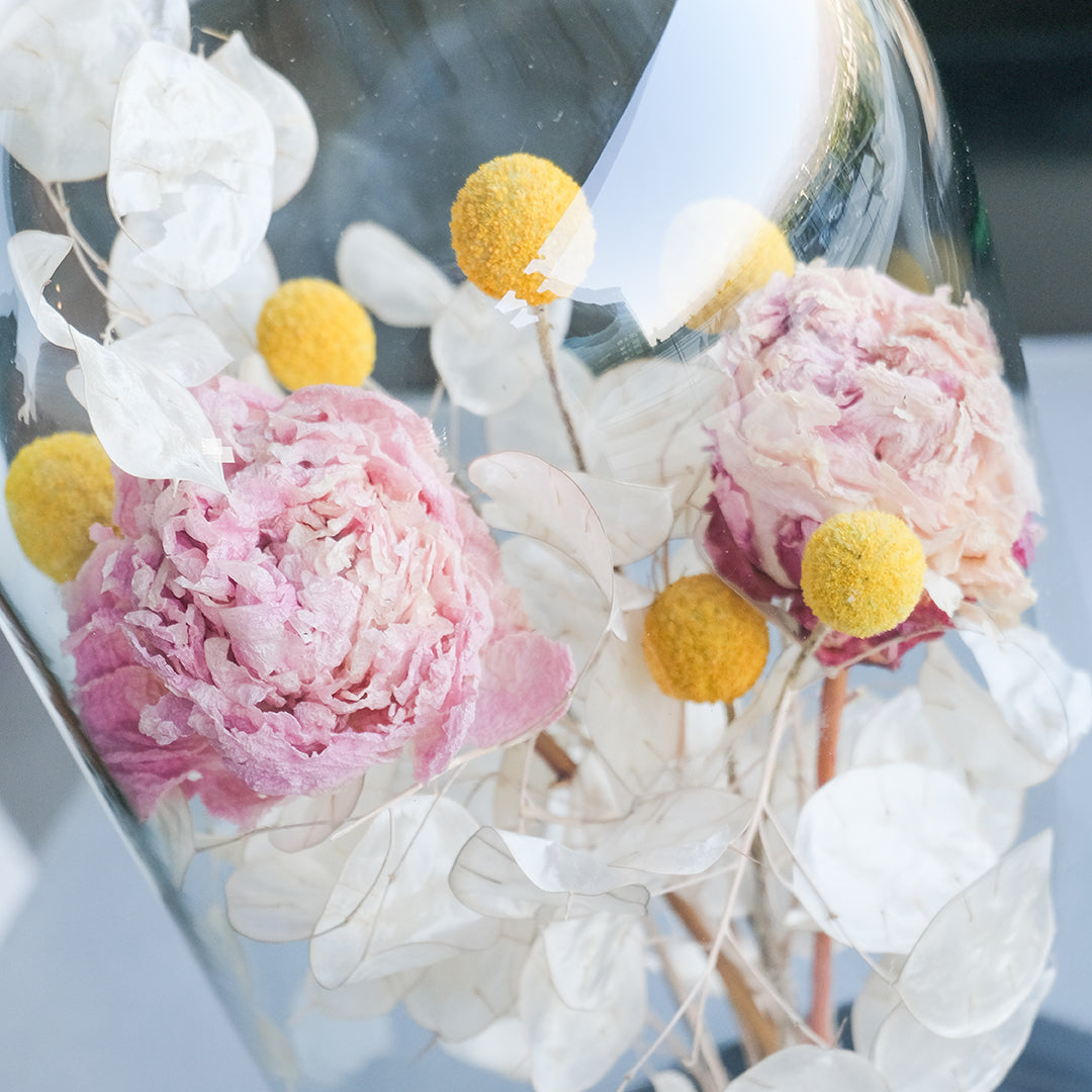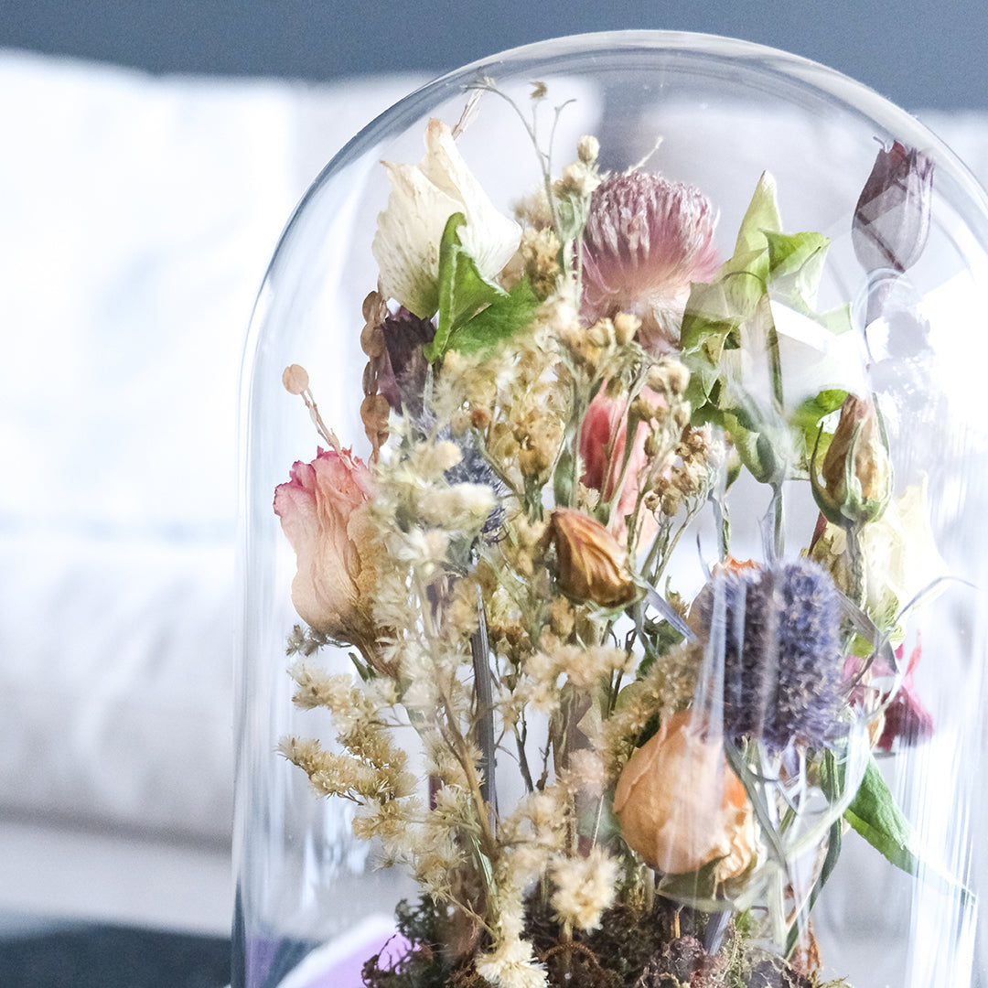 Cada cúpula es elaborada a mano con dedicación y respeto por la naturaleza, preservando las flores secas en una composición artística.