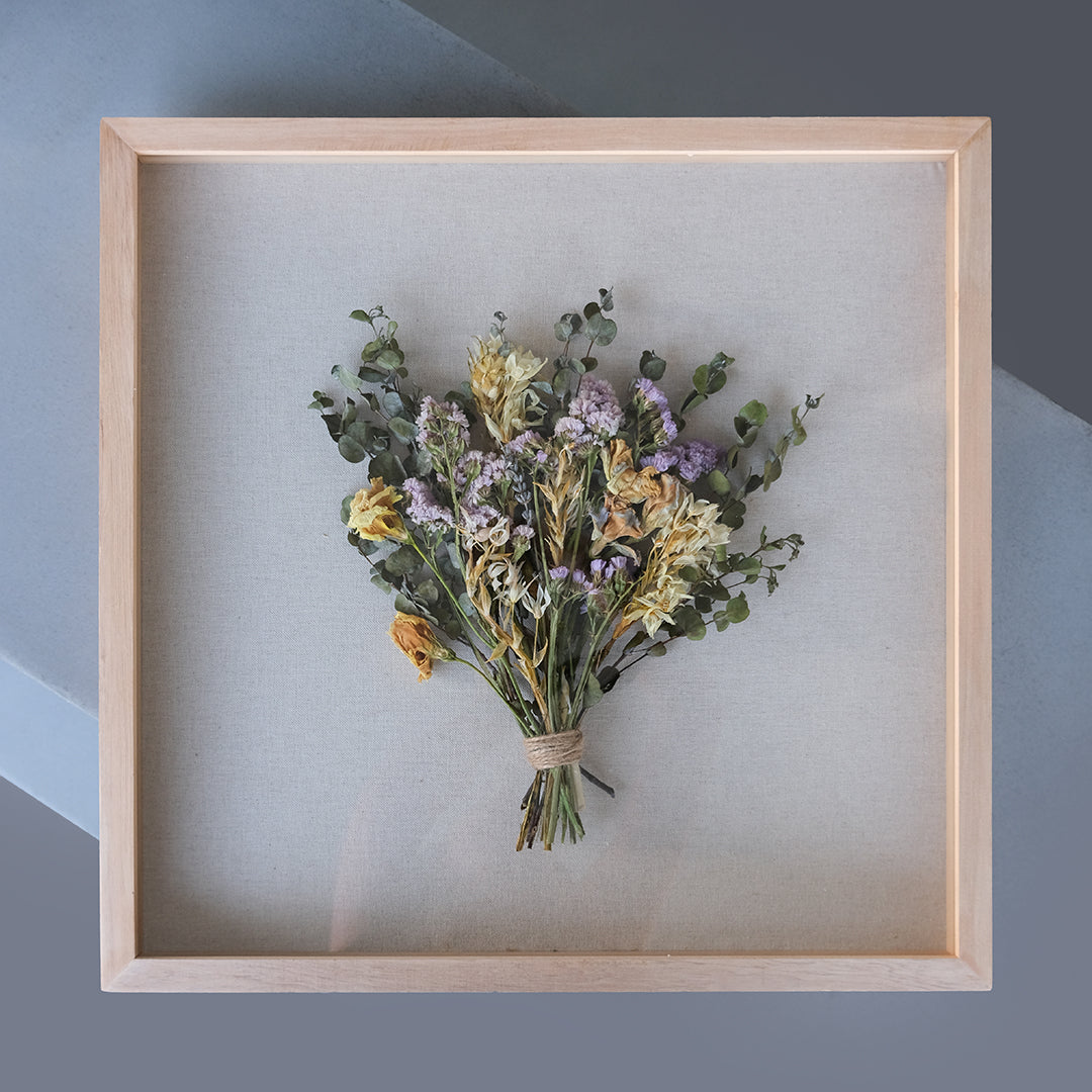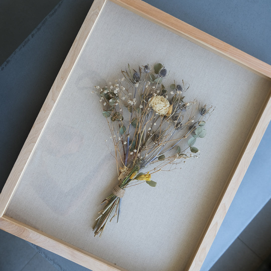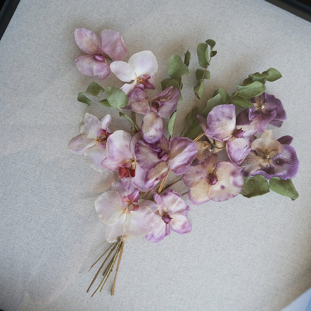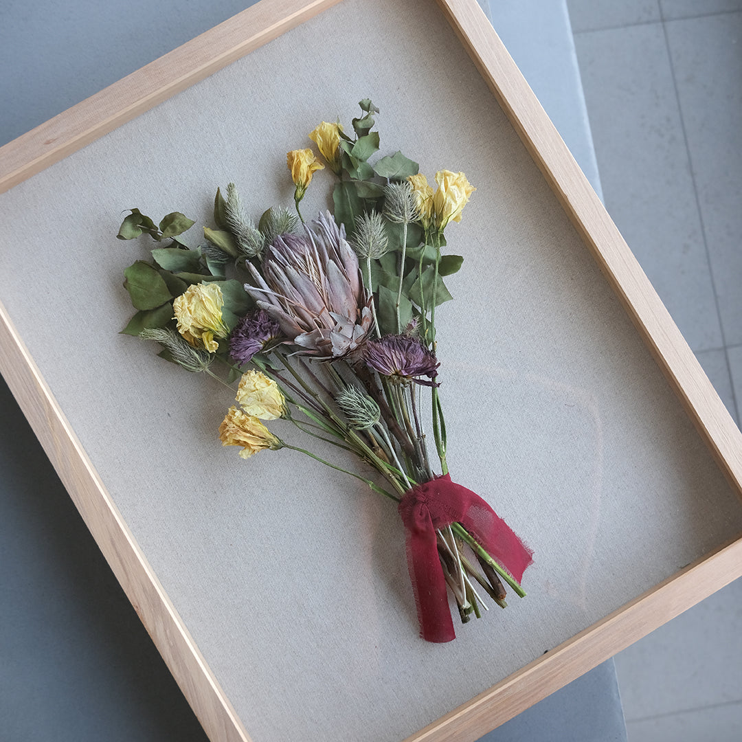 Ramo de novia seco con su forma real sobre lino y enmarcado.