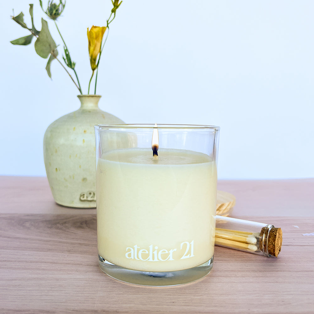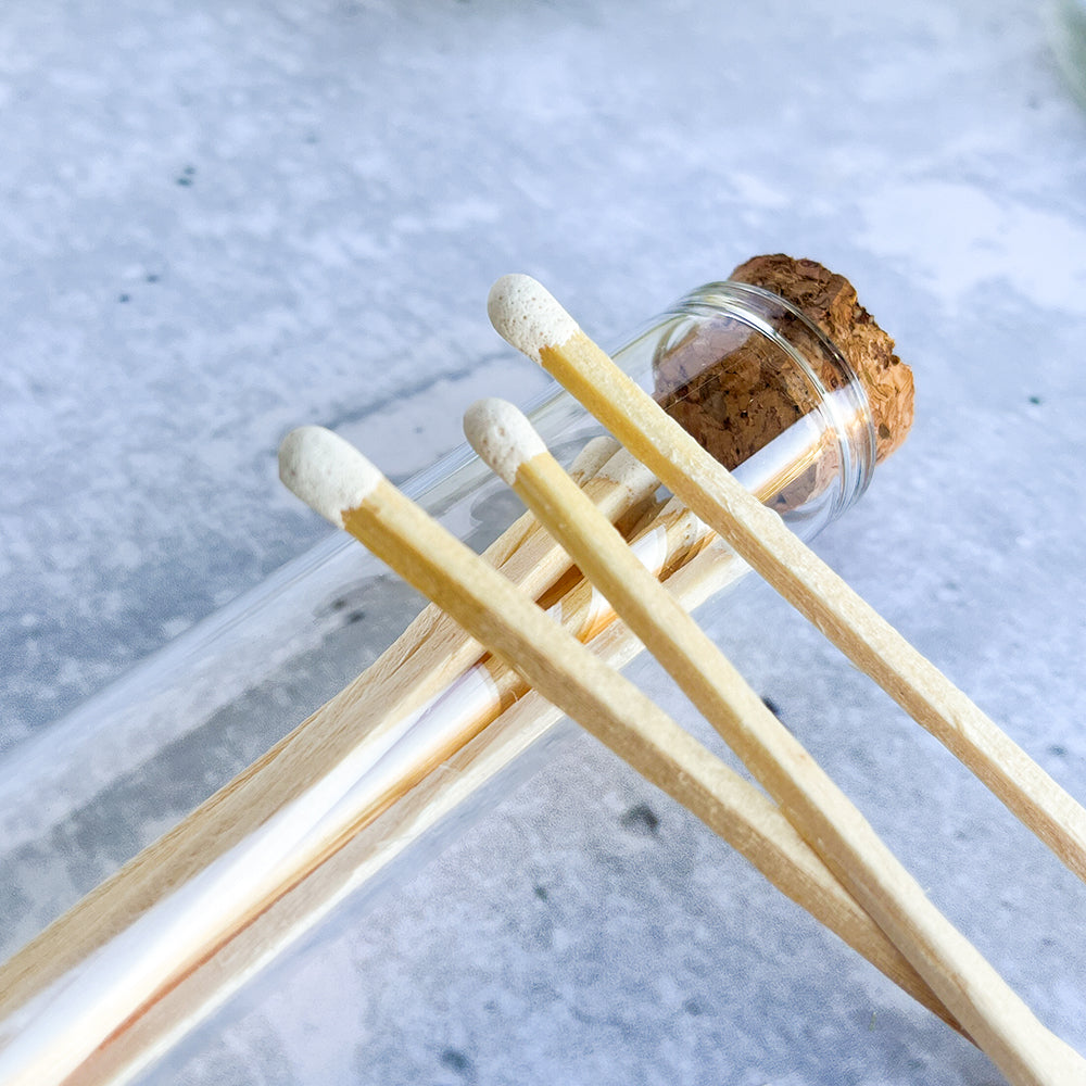 Incluye un set de fósforos con cabeza de color blanco, presentado en un envase de vidrio con raspador en la parte inferior.